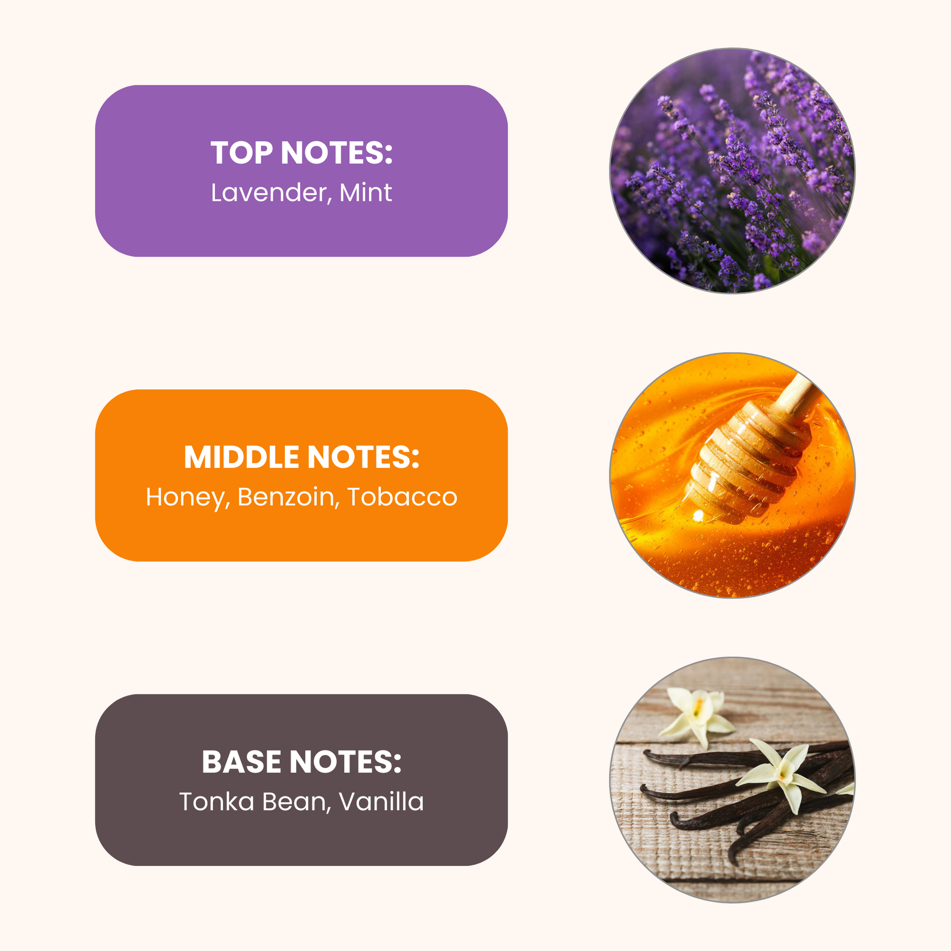 An intoxicating warmth that smolders with confidence. Ember opens with a fresh and aromatic touch of lavender before descending into a rich, golden heart of addictive honey and smooth tobacco. The experience settles into a deep and incredibly sensual base of creamy vanilla and warm tonka bean, leaving an unforgettable and powerful trail.